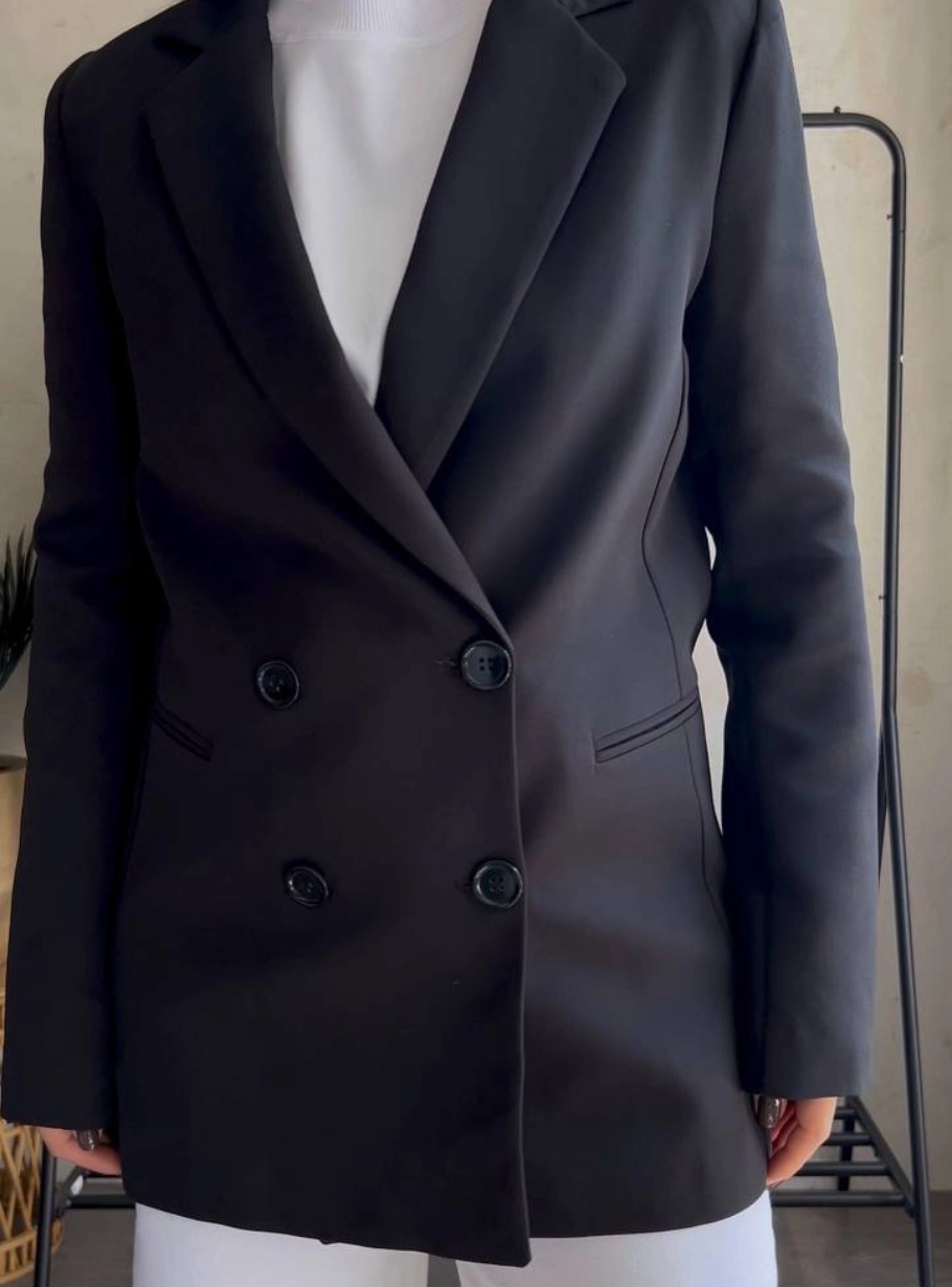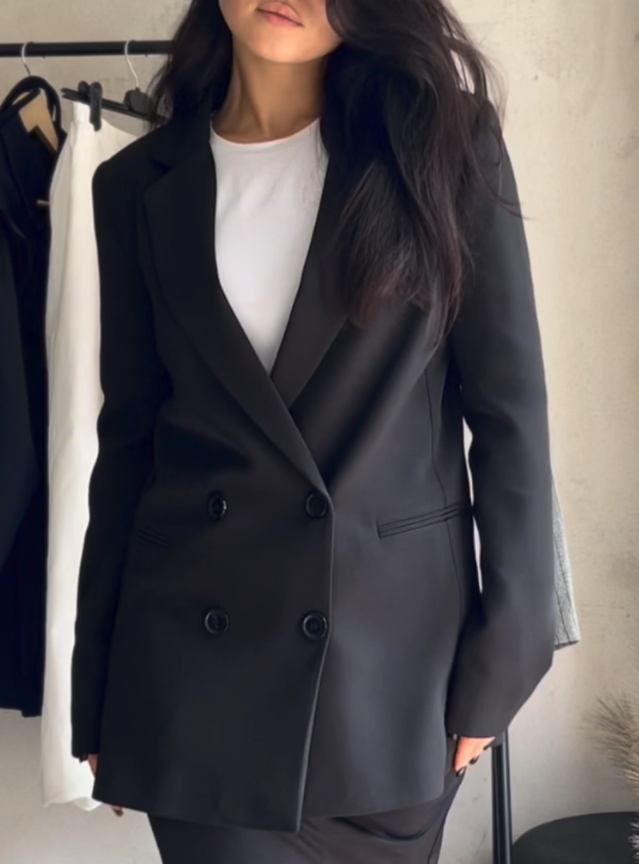 Базовий чорний жакет — незамінна річ у гардеробі, яка завжди виглядає бездоганно. Лаконічний силует із подовженим кроєм і двобортною застібкою додає образу структури, а щільна костюмна тканина забезпечує комфорт і гарну посадку.