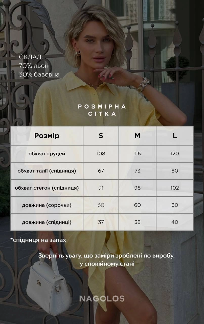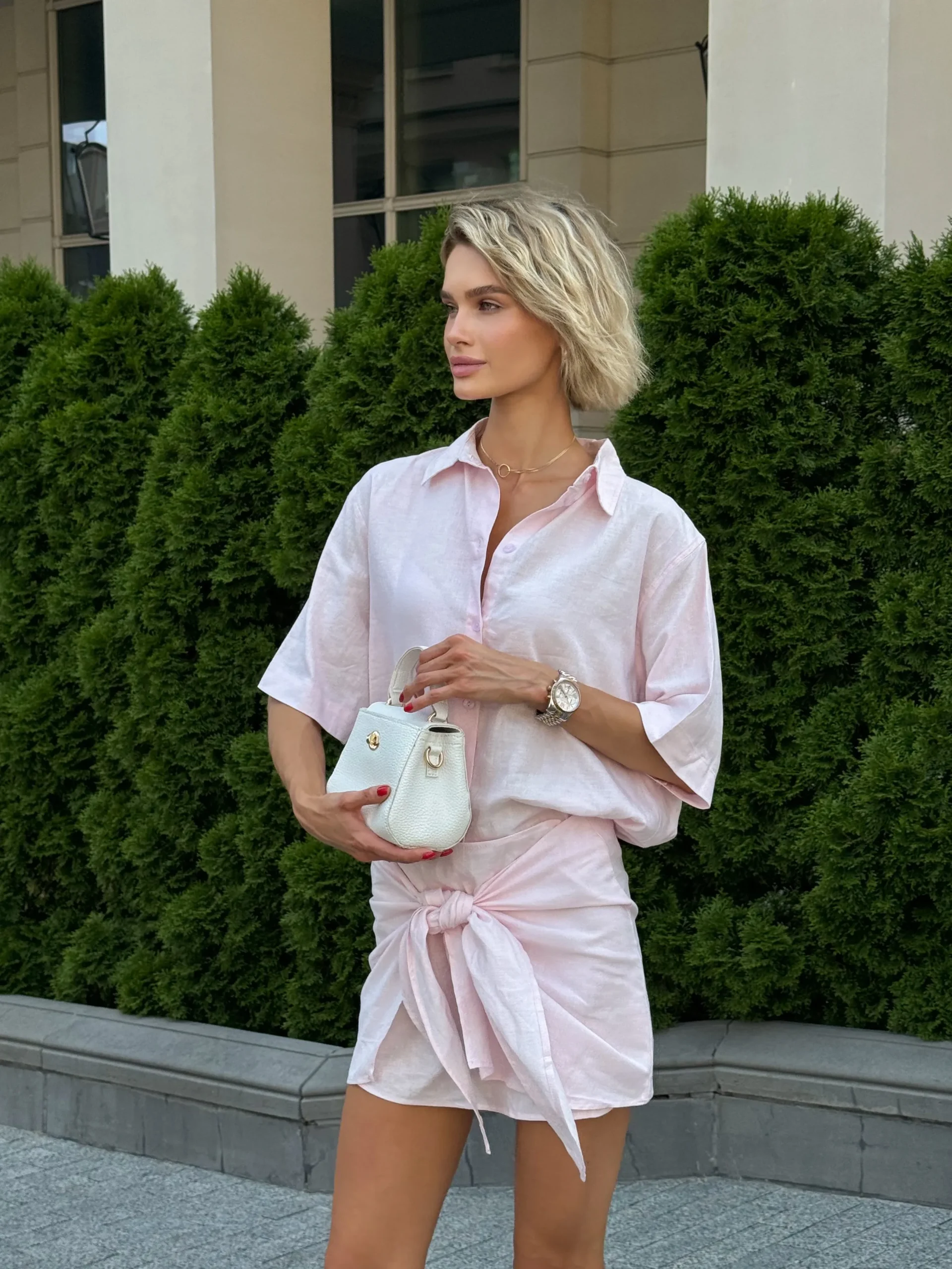 Сорочка вільного крою з коротким рукавом додає легкості, а спідниця зі стильним вузлом створює акцент на талії й формує жіночний силует. Разом вони виглядають effortlessly chic — ідеальний варіант для прогулянок, подорожей чи відпочинку біля моря.