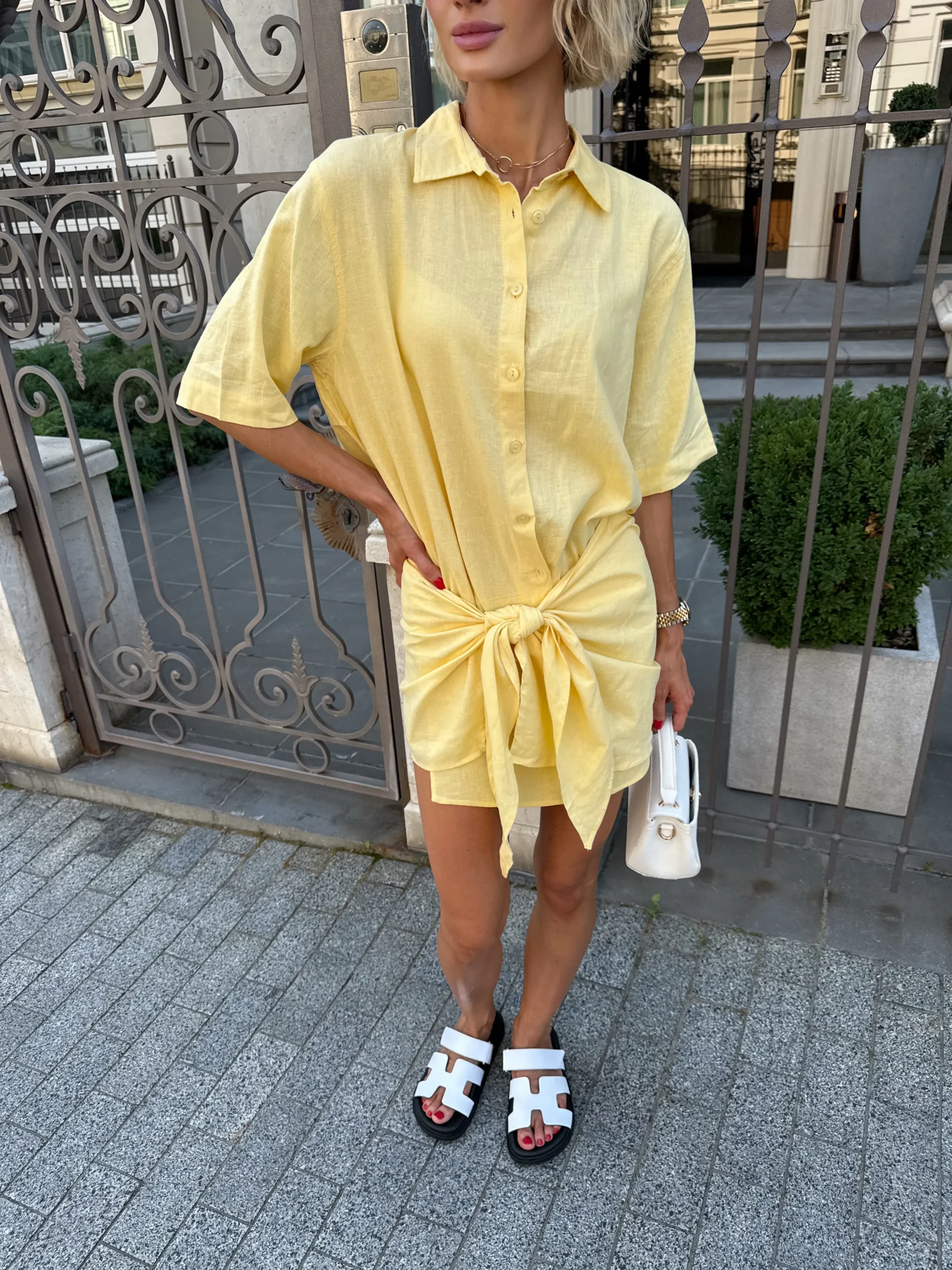 Сорочка вільного крою з коротким рукавом додає легкості, а спідниця зі стильним вузлом створює акцент на талії й формує жіночний силует. Разом вони виглядають effortlessly chic — ідеальний варіант для прогулянок, подорожей чи відпочинку біля моря.
