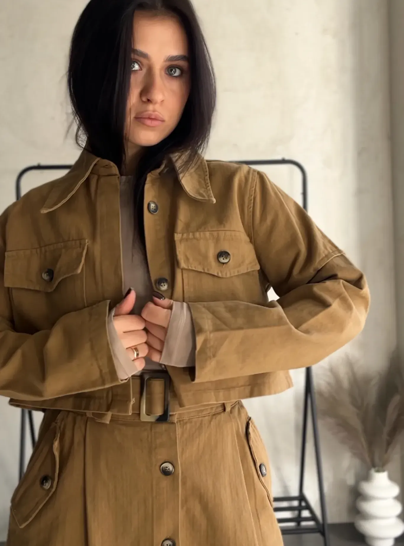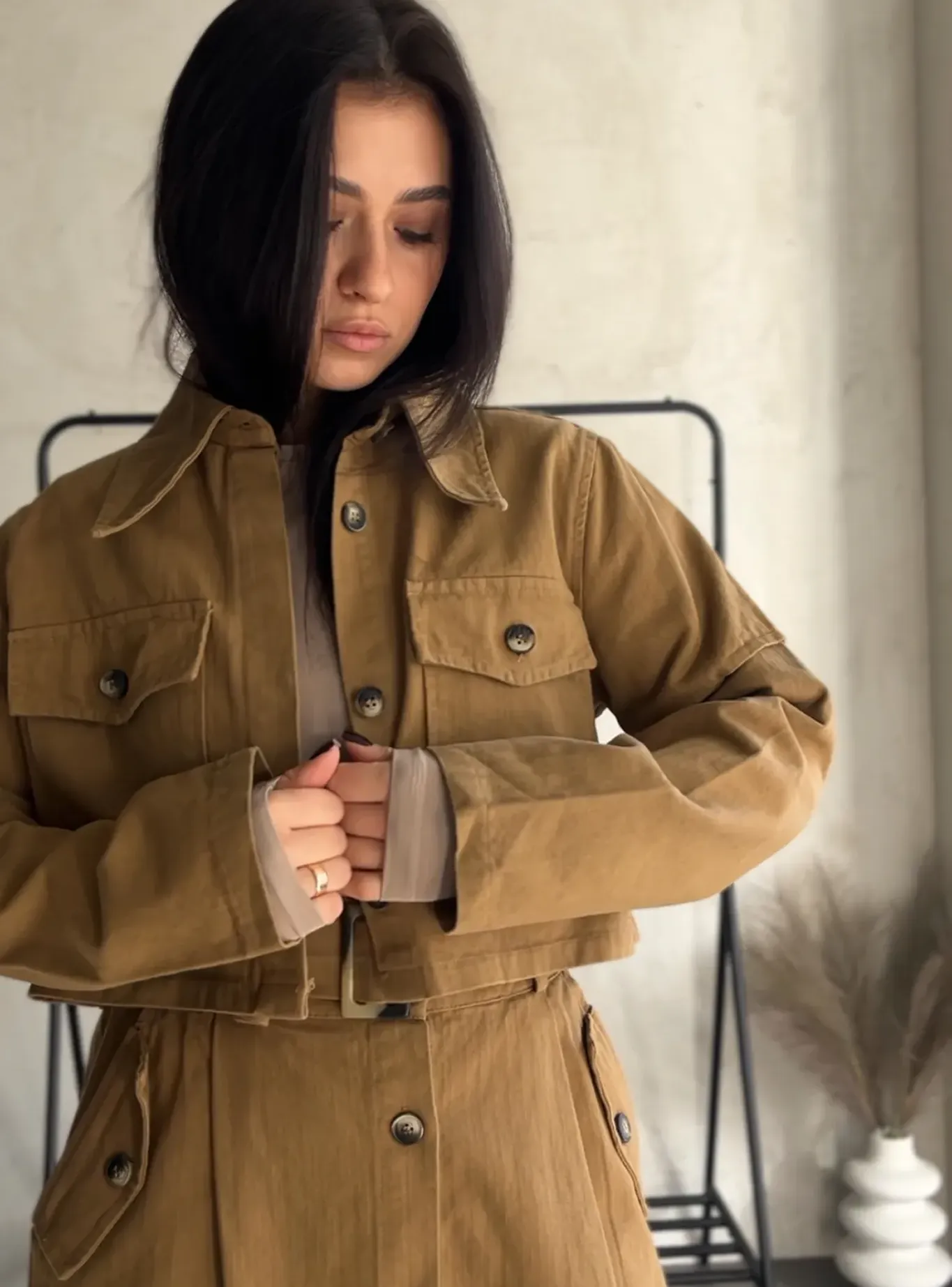 Цей костюм — ідеальний баланс між структурою та комфортом. М’яка щільна бавовна приємна до тіла, гарно тримає форму й водночас не сковує рухів. Укорочена куртка з накладними кишенями додає образу характеру, а спідниця на гудзиках із поясом створює лінію талії та підкреслює фігуру.