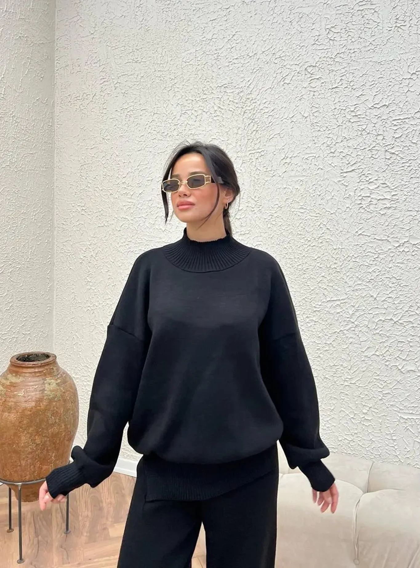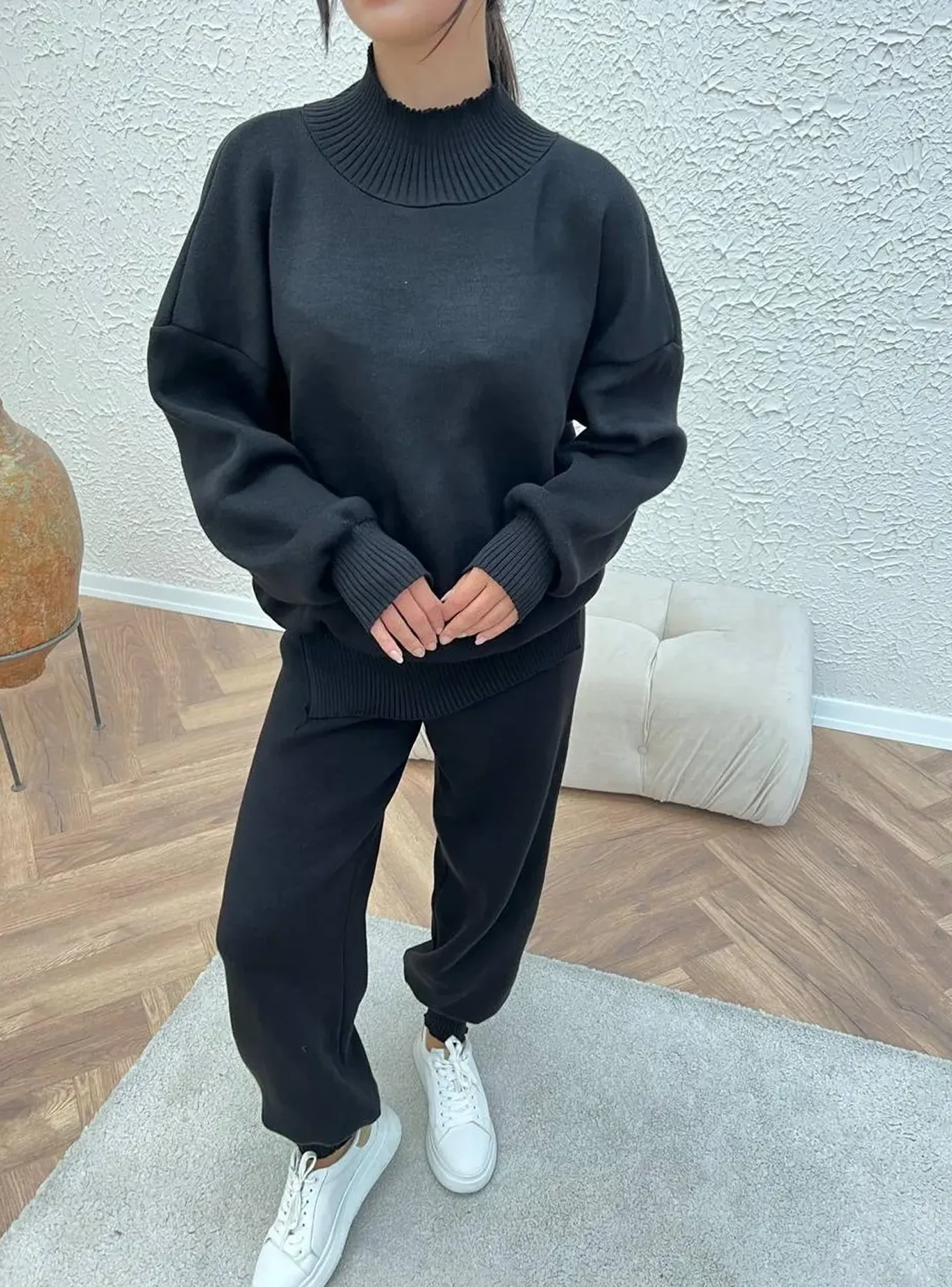 Теплий, м’який і бездоганно зручний — цей костюм створений для тих, хто любить виглядати стильно навіть у relaxed-форматі. Глибокий відтінок додає образу вишуканості, а об’ємний светр і штани з манжетами забезпечують комфорт у кожному русі.