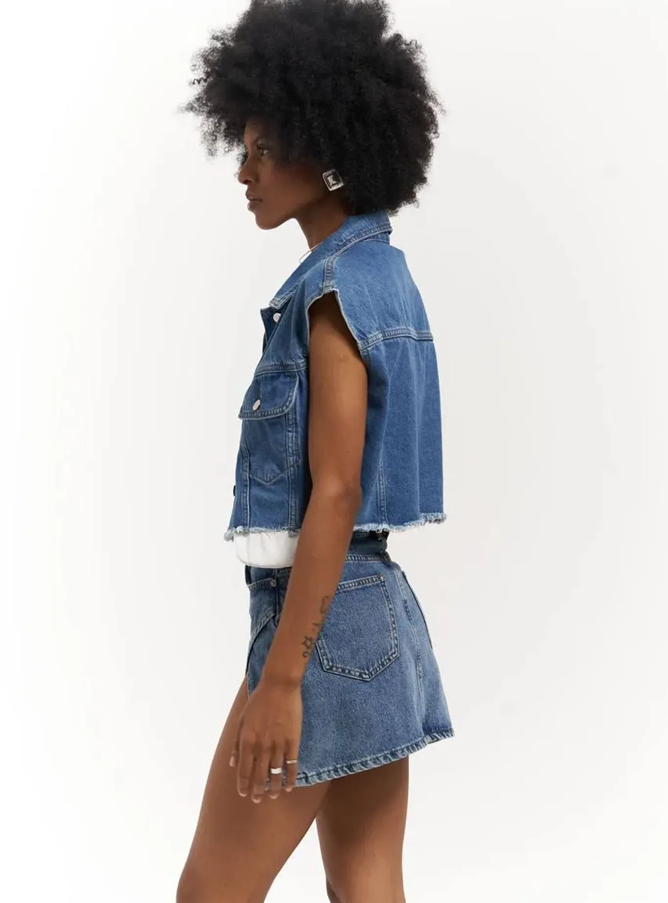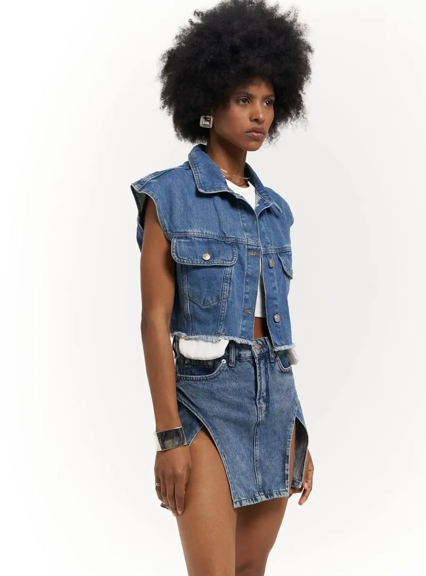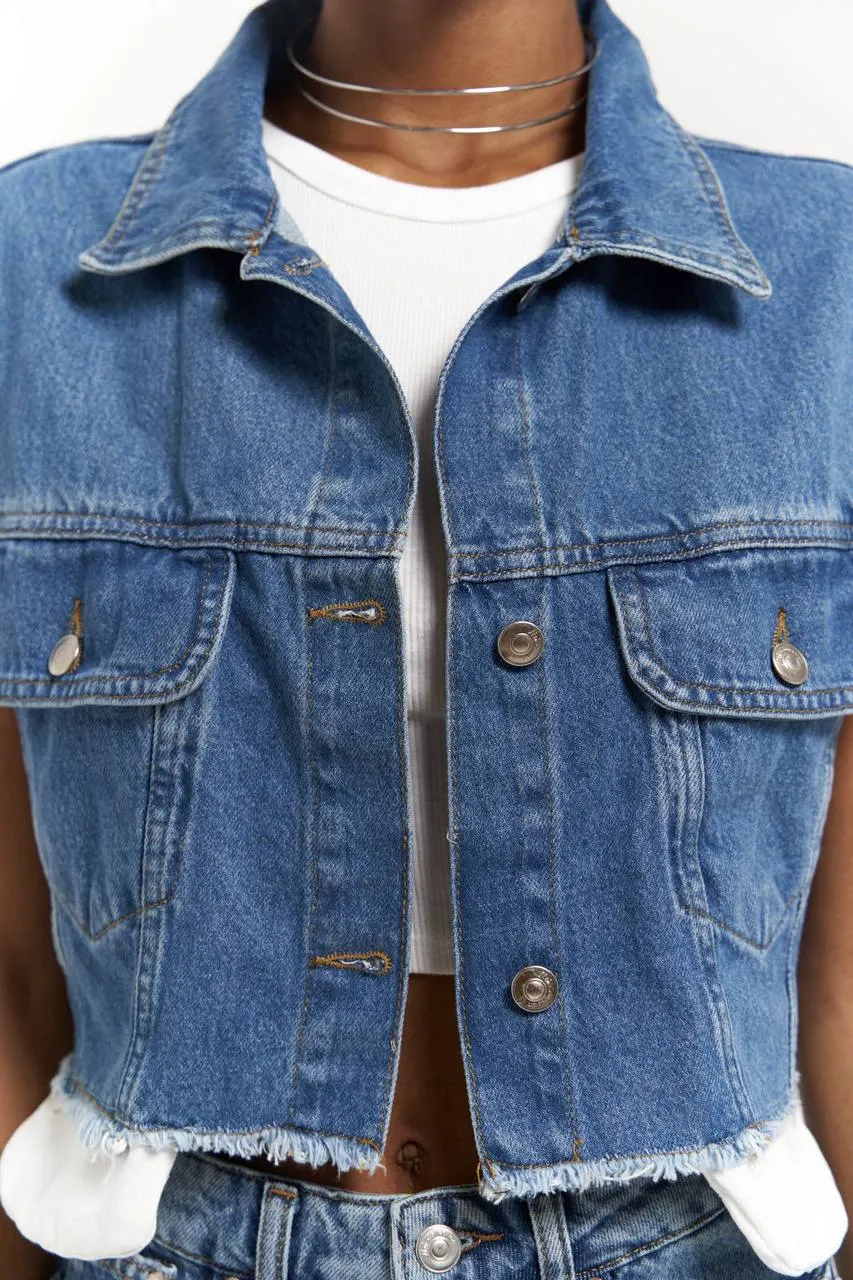 Модний, сміливий і універсальний — цей укорочений жилет із щільного деніму стане акцентом у будь-якому образі. Класичний крій із коміром і накладними кишенями поєднано з необробленим краєм, що додає легкого бунтарського настрою.