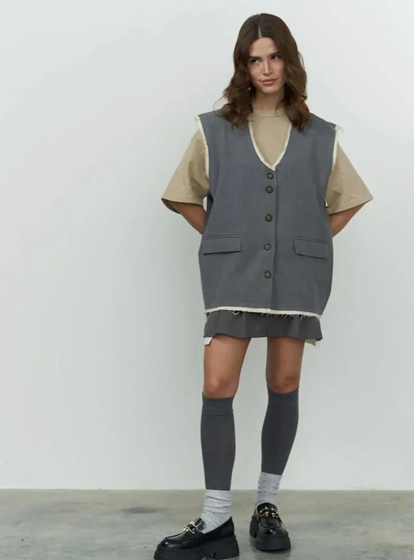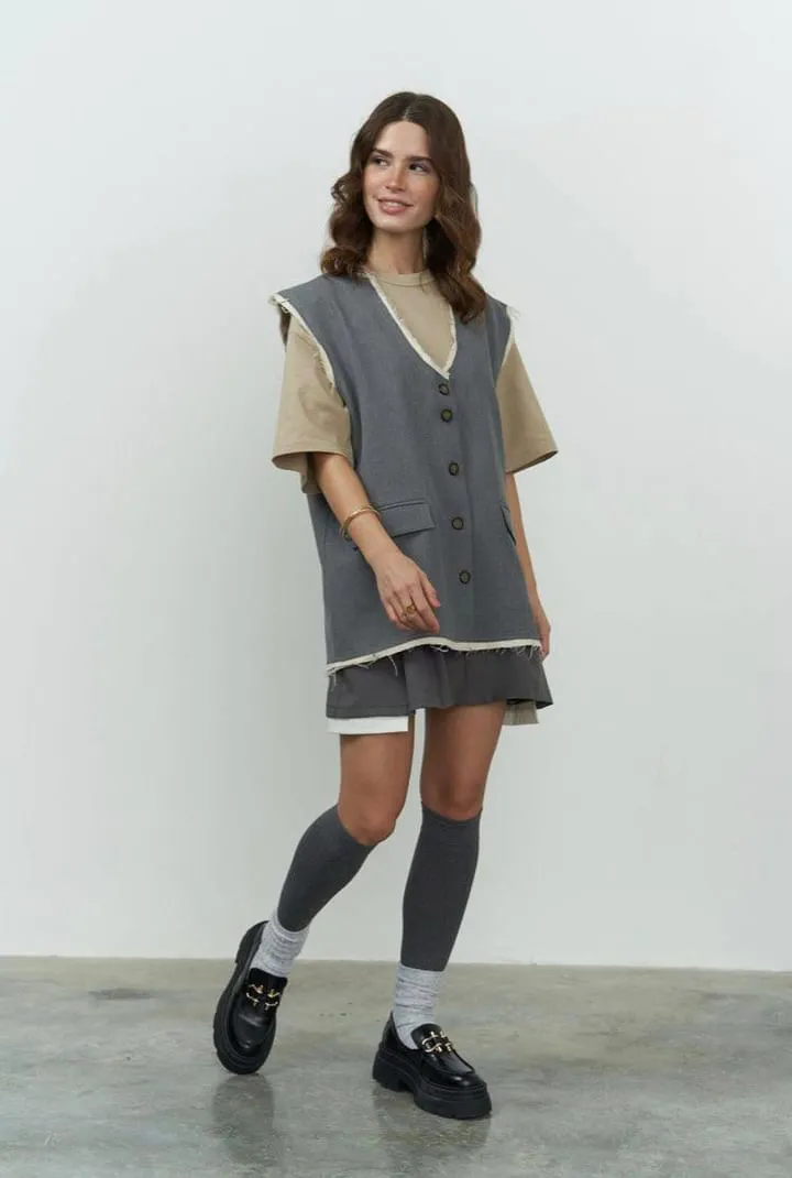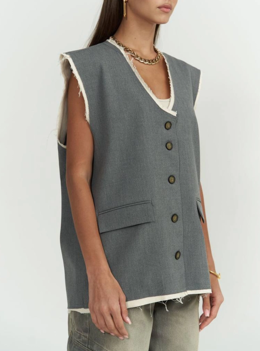 Стильна інтерпретація класичного жилету — вільний подовжений крій, лаконічний дизайн і виразна текстура необроблених країв створюють ефект effortless chic. Контрастна внутрішня обробка підкреслює форму, додаючи сучасного акценту.
