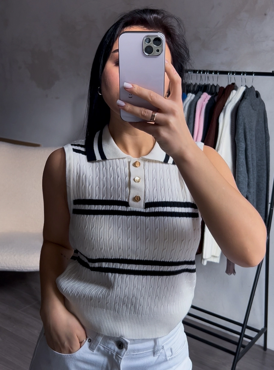 М’яка фактурна в’язка, аккуратні смужки та комір-поло створюють той самий ефект effortless chic, коли виглядаєш дуже красиво без зайвих зусиль.