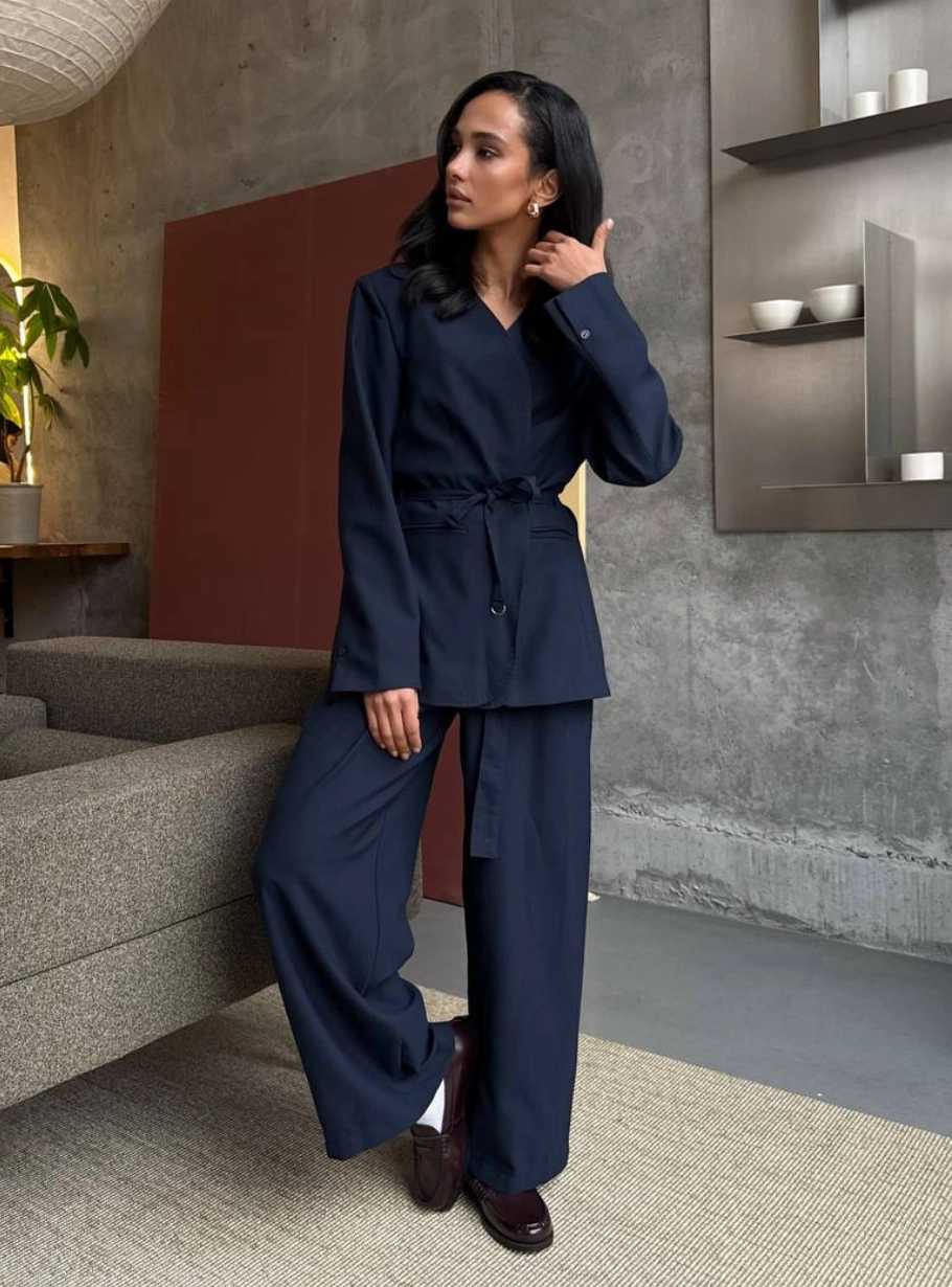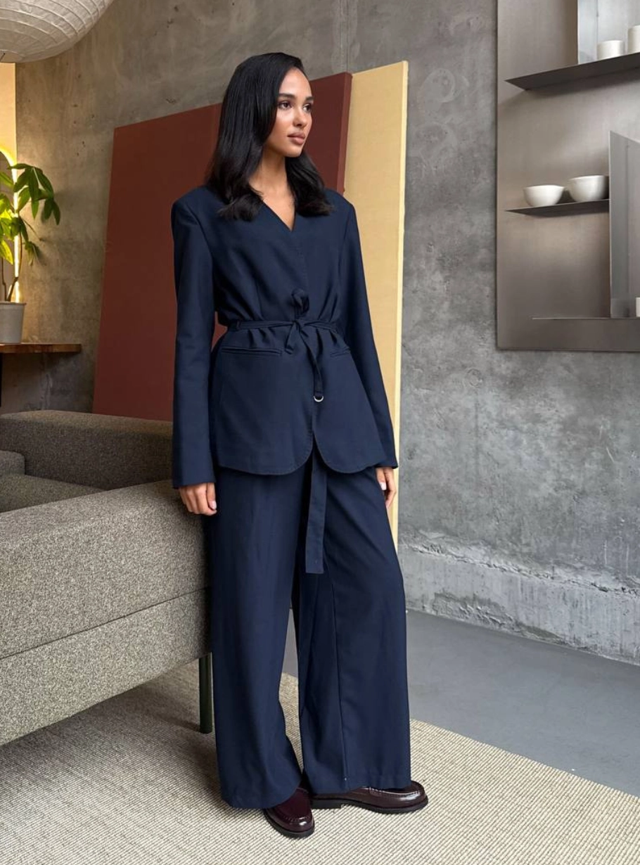 Цей костюм створений для тих, хто цінує лаконічність і комфорт одночасно. Прямий жакет без ґудзиків із поясом підкреслює талію, додаючи жіночності строгому силуету, а вільні штани забезпечують легкість рухів і сучасну посадку.