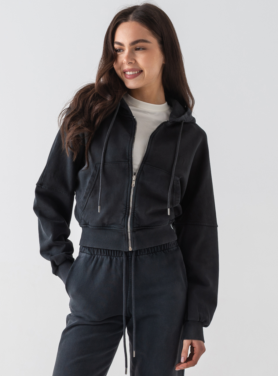 Худі вільного крою з блискавкою та великими карманами додає образу легкого street-vibe, а штани візуально подовжують ноги й створюють супер комфортну посадку