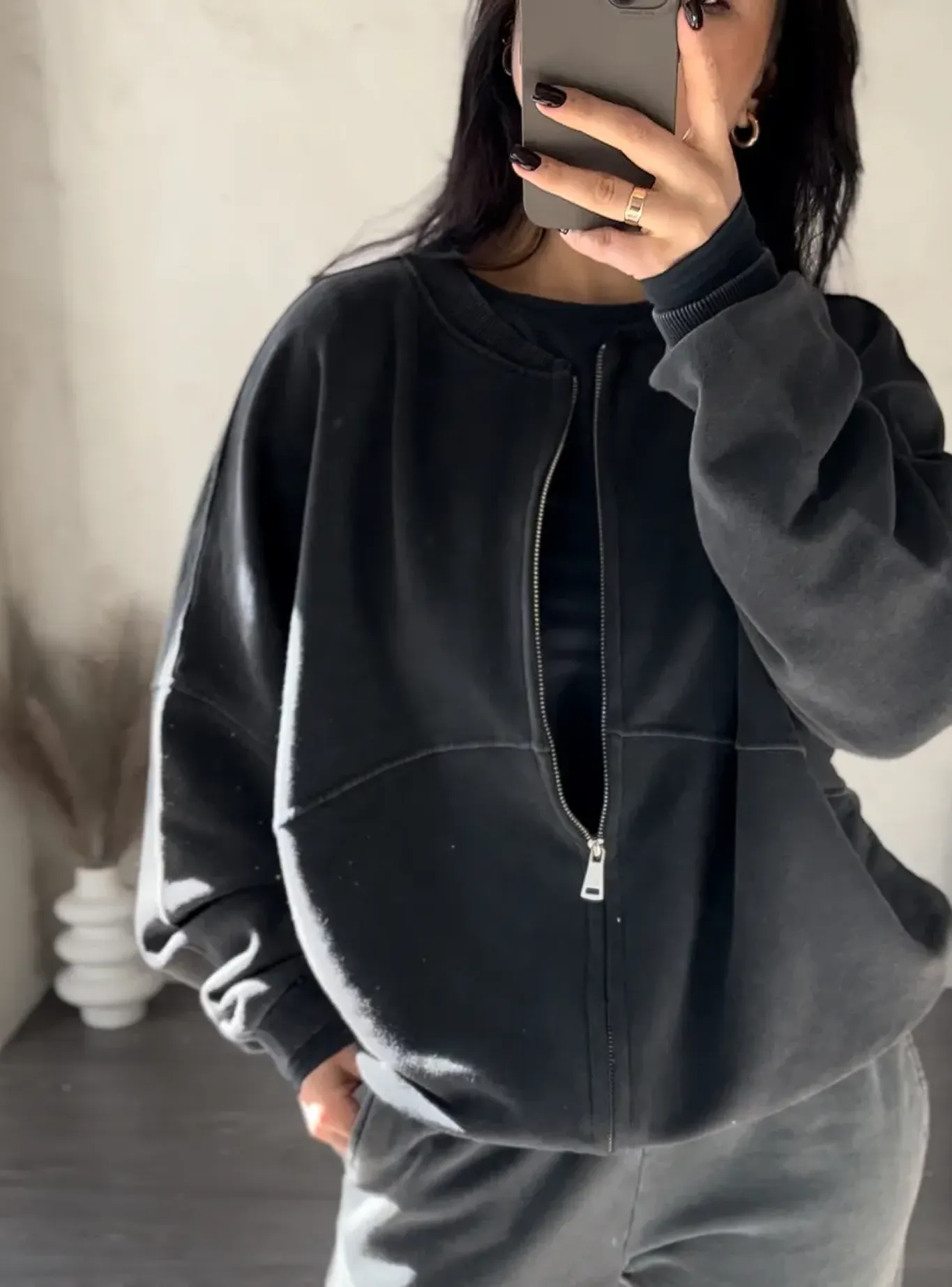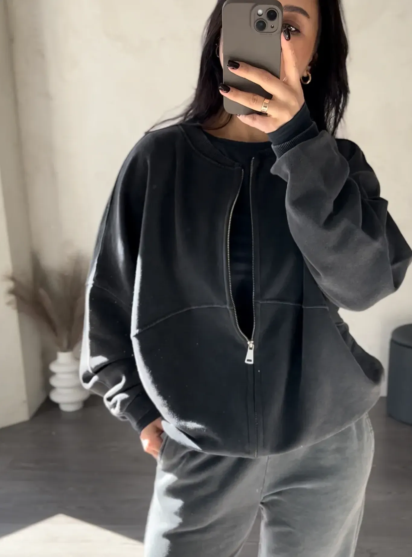 М’яка бавовняна тканина приємна до тіла, а продуманий фасон із блискавкою по всій довжині робить її зручною для щоденного носіння. Носіть як верхній шар замість світшота або поєднуйте з топом і штанами у спортивному стилі.