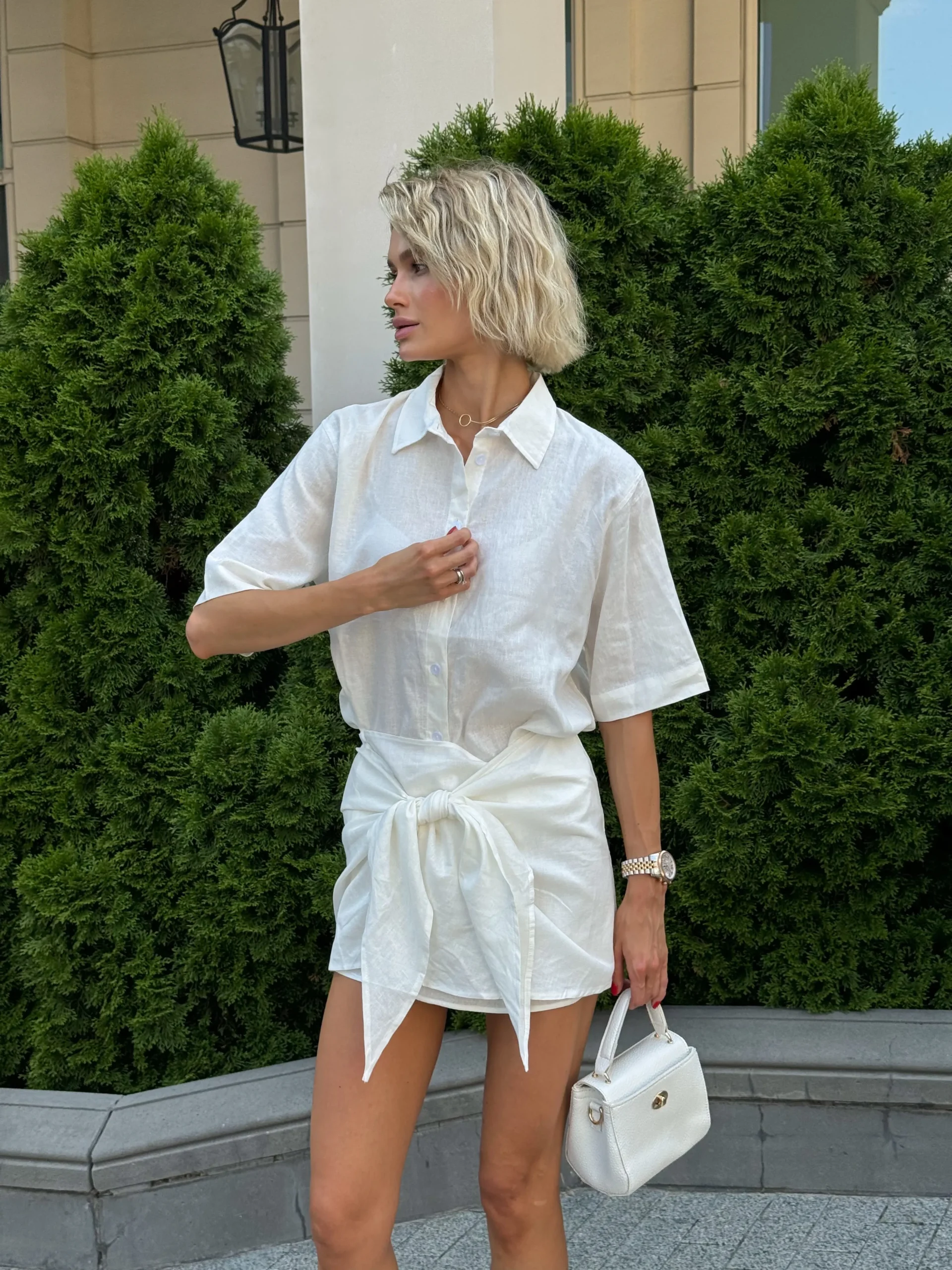 Сорочка вільного крою з коротким рукавом додає легкості, а спідниця зі стильним вузлом створює акцент на талії й формує жіночний силует. Разом вони виглядають effortlessly chic — ідеальний варіант для прогулянок, подорожей чи відпочинку біля моря.