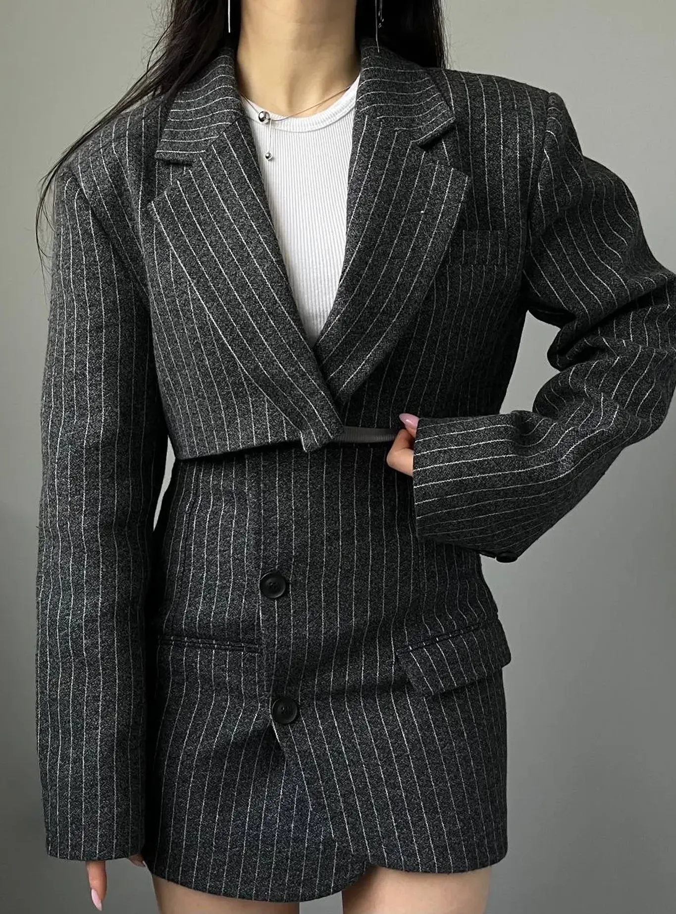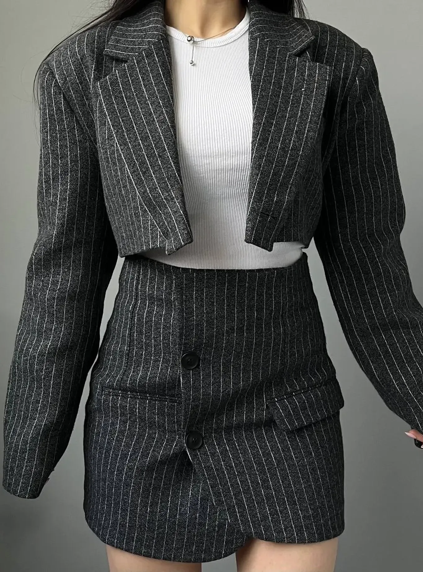 Сучасний варіант класики, що підкреслює жіночність і силу стилю. Укорочений жакет і мініспідниця створюють витончений силует, а вертикальна смужка візуально подовжує фігуру, додаючи стриманої динаміки. Щільна тканина тримає форму, але водночас еластична — костюм комфортно сідає по фігурі та зберігає акуратний вигляд упродовж дня.