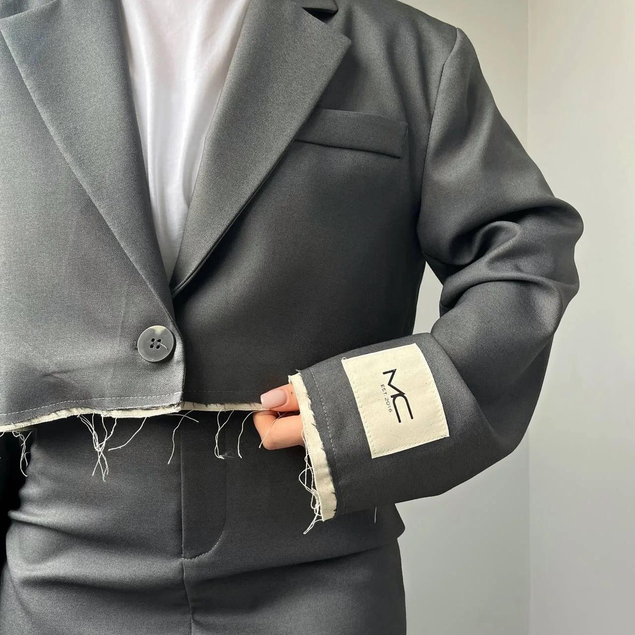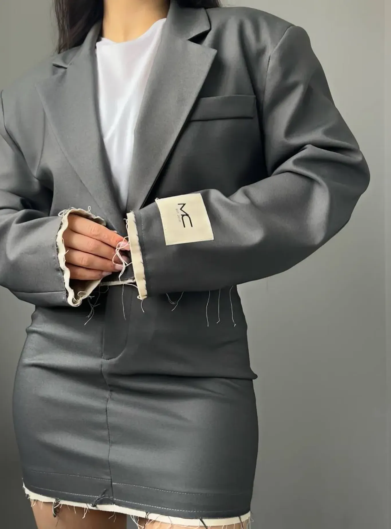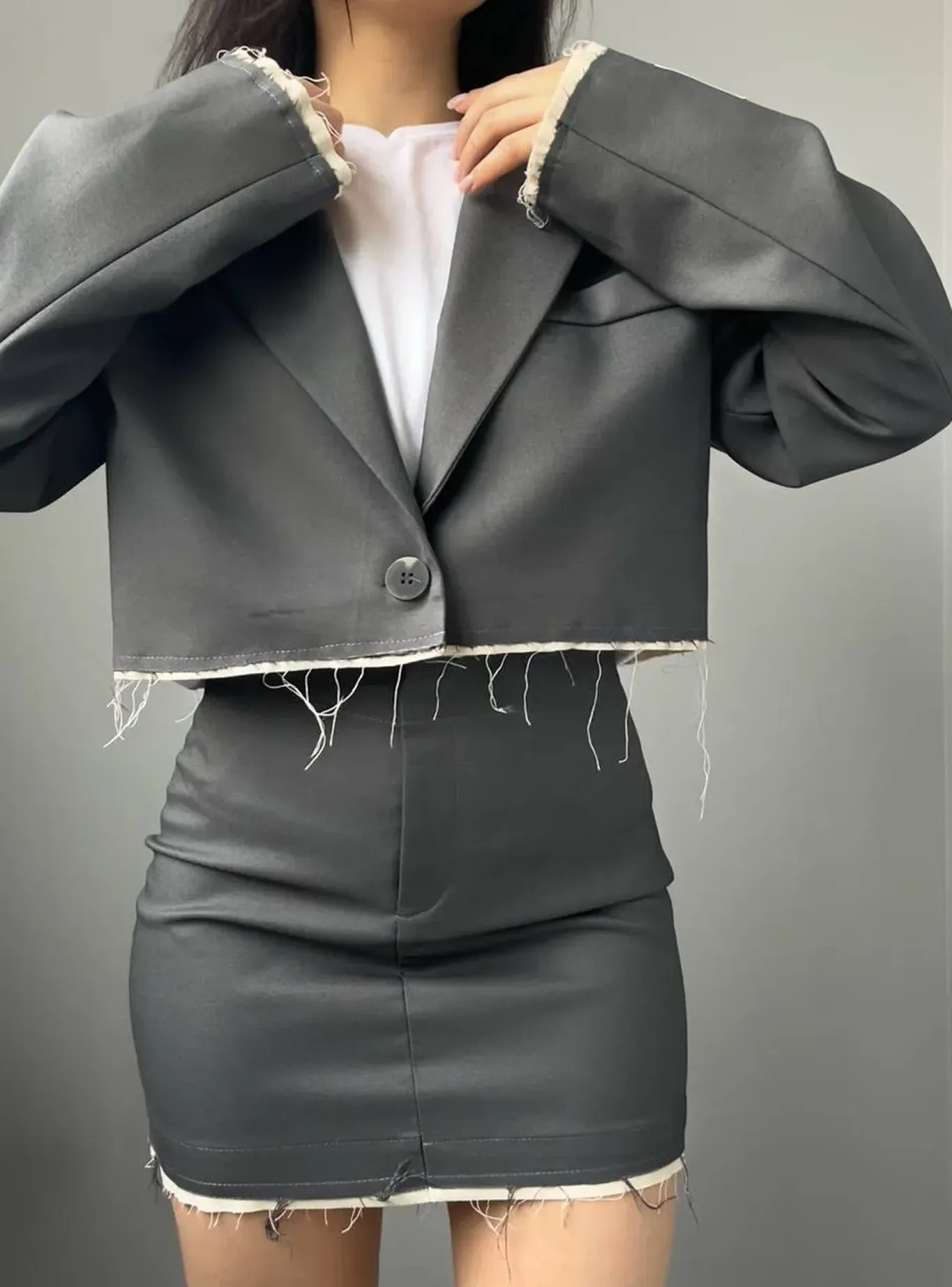 Цей костюм — про сучасну інтерпретацію класики. Строгий крій жакета та мініспідниця поєднуються з необробленими краями, створюючи ефект легкої неформальності та бунтарської елегантності.