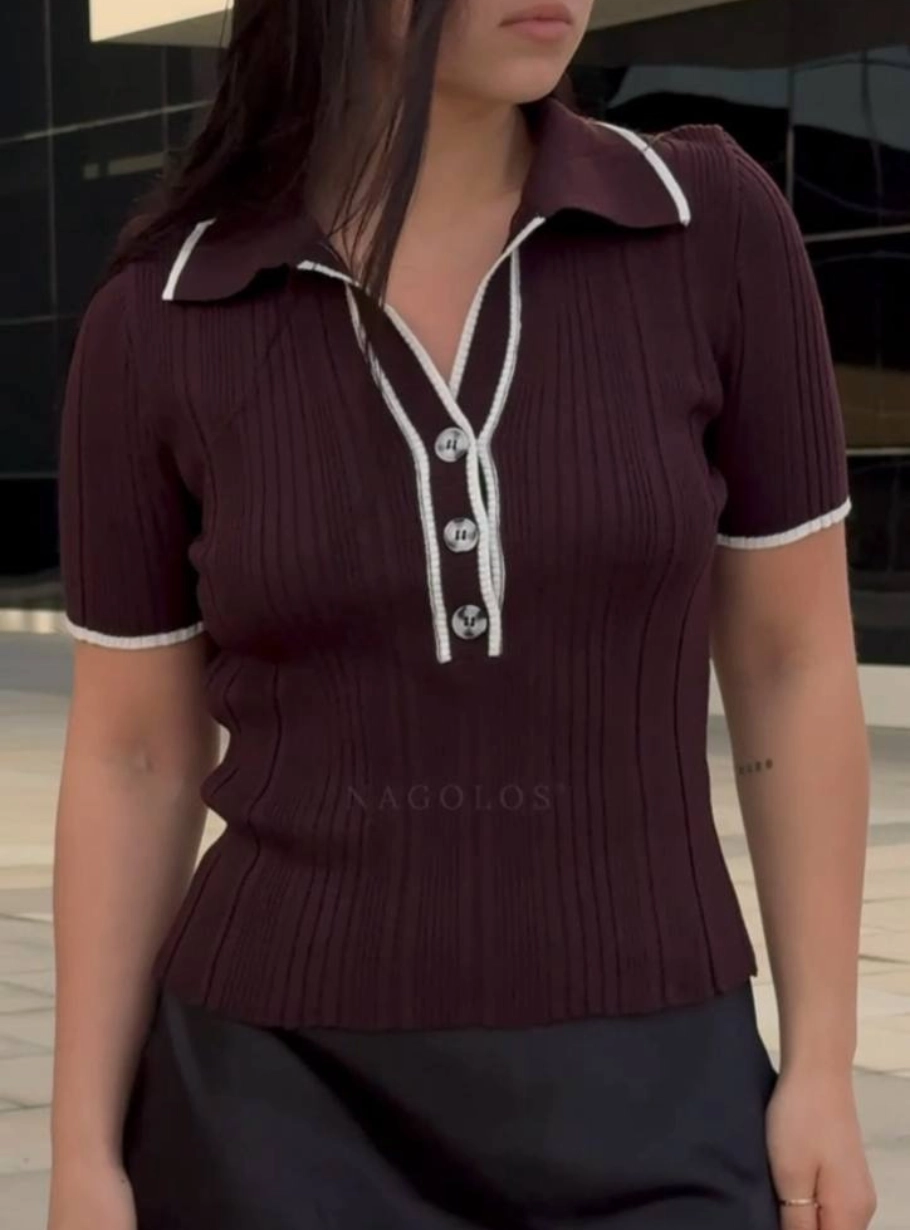 Вишукане трикотажне поло, яке одразу додає образу елегантності. Глибокий насичений колір підкреслює фігуру, а вертикальний рубчик візуально струнить та робить силует акуратнішим. Контрастна окантовка та ряд стильних гудзиків створюють той самий ефект “дорогого мінімалізму”, коли кожна деталь працює на загальний вигляд.