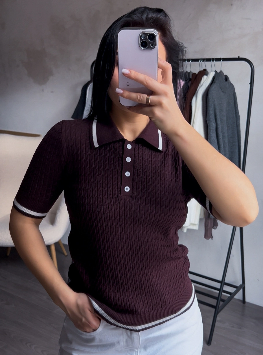 Це поло — поєднання класики й фактурності, яке одразу робить образ більш зібраним і стильним. В’язаний візерунок «косичка» додає глибини та делікатного об’єму, а контрастні смужки на комірі, рукавах і по краю виробу — елегантного акценту.