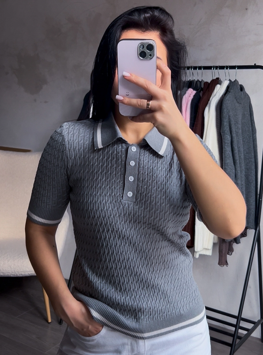 Це поло — поєднання класики й фактурності, яке одразу робить образ більш зібраним і стильним. В’язаний візерунок «косичка» додає глибини та делікатного об’єму, а контрастні смужки на комірі, рукавах і по краю виробу — елегантного акценту.