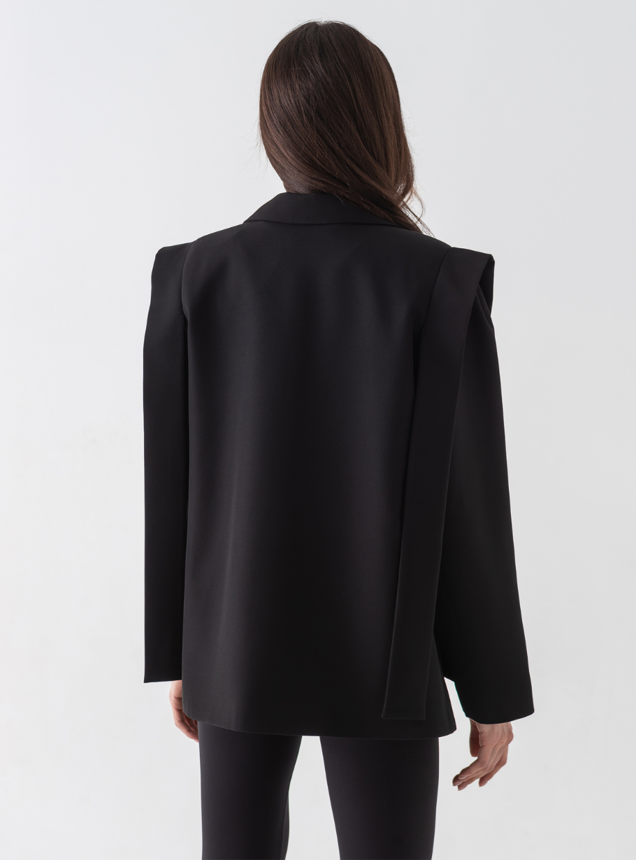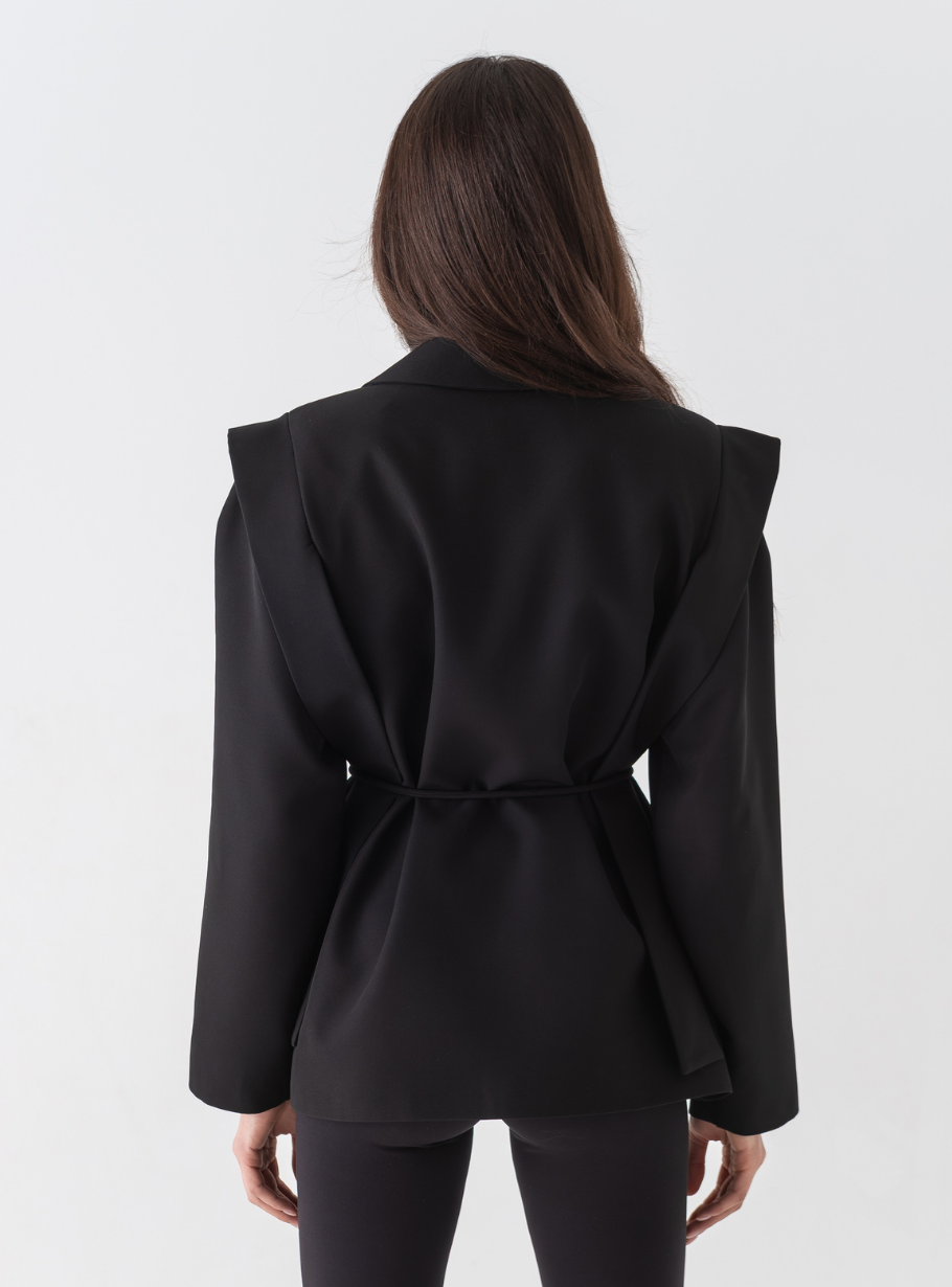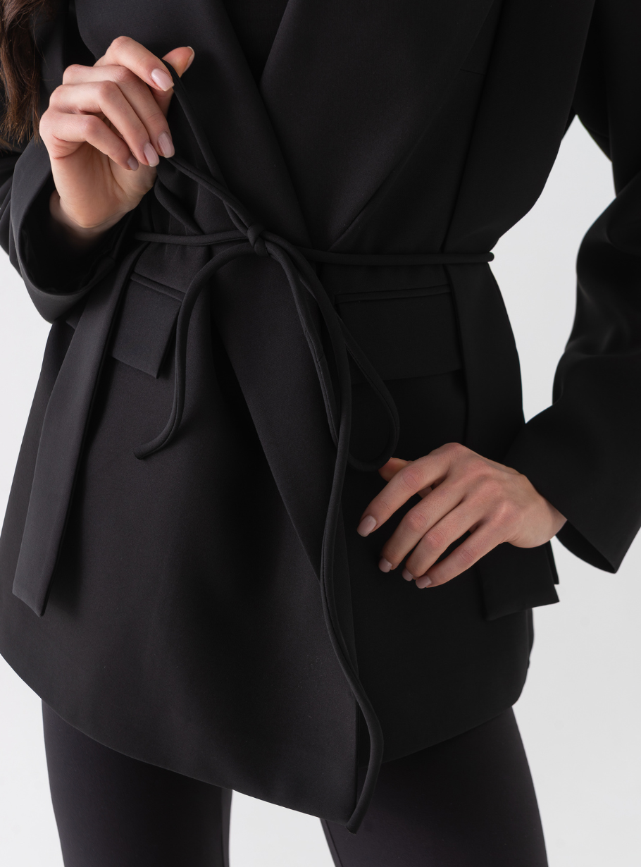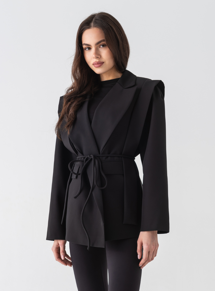 Жакет, що виглядає розкішно в будь-якому образі — від офісного до вечірнього. Сучасний крій із широкими лацканами та акцентним поясом формує витончений силует, підкреслюючи лінію талії.