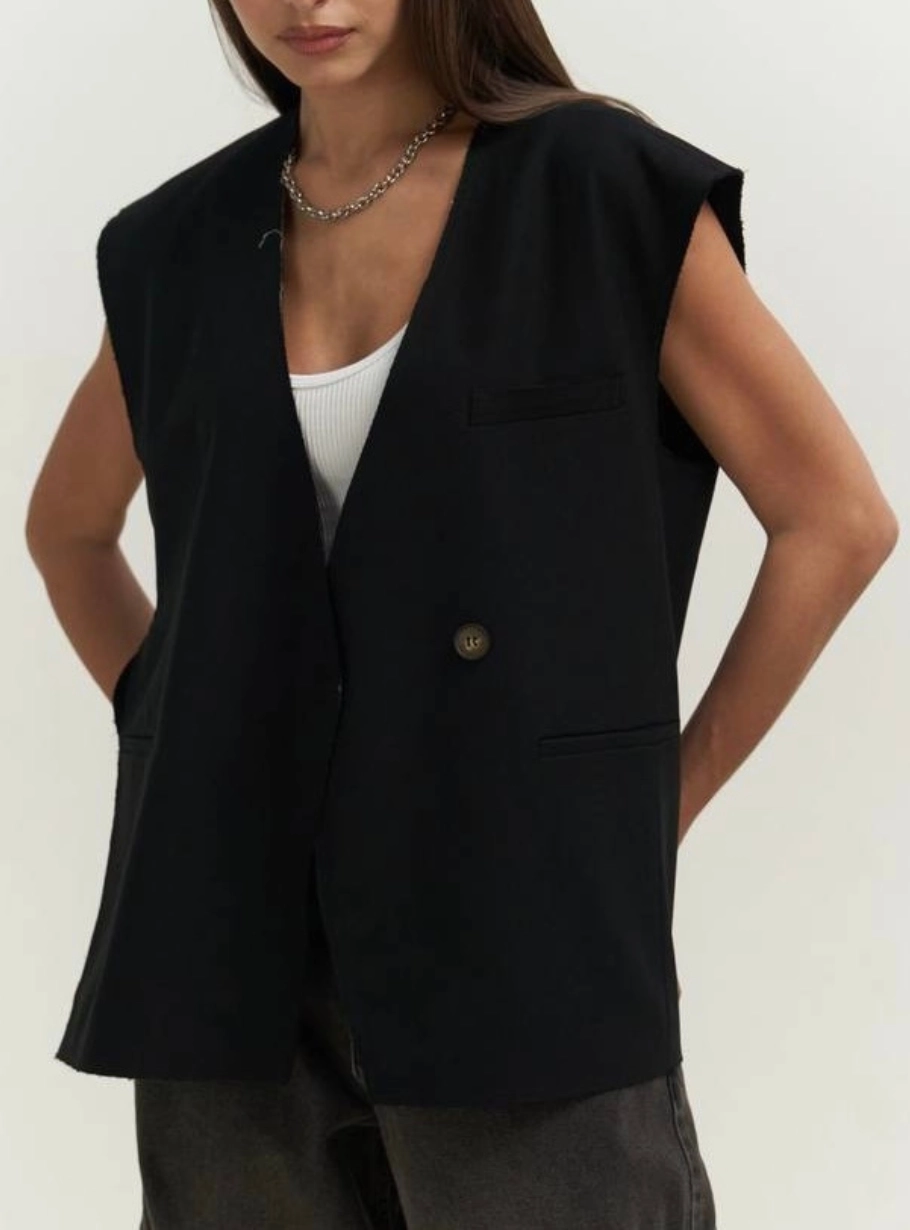 Лаконічний, структурний і водночас невимушено стильний — цей жилет створений для поціновувачок мінімалізму з характером. Подовжений крій формує витончений силует, а необроблені краї додають сучасного акценту та легкого бунтарства.